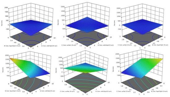 3D surface of the effect of independent variables (from left to right: solid lipid concn. vs. liquid lipid concn., solid lipid concn. vs. surfactant concn., and liquid lipid concn. vs. surfactant concn.) on the size of NLCs using Softisan® 100 (top) and Gelucire® 44/14 (bottom row).
