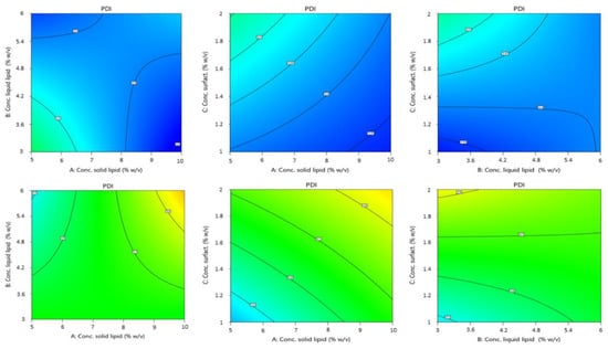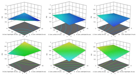 On the other hand, surfactant concentration was another variable that had great impact. ANOVA data show that increasing the surfactant concentration increases the PDI. This may be due to the fact that larger amounts of surfactant tend to give the non-uniform thickness of surfactant layers on the surface of particles, which affects the size and shape of the particles, giving inhomogeneity between them and increasing the PDI value [43,44]. The concentration of solid lipid has little influence compared to the influence of the concentration of surfactant, and a tendency to increase the PDI value if the concentration increases. This is probably due to an increase in the viscosity of the organic phase on which the aqueous phase is dripped, resulting in a slower diffusion of the organic phase into the outer phase, which may give rise to the formation of aggregates and uneven distribution of the particles [45].