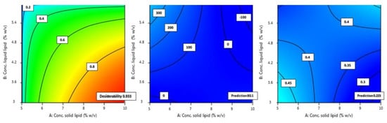 Contour plot of optimized formulation in terms of desirability, size, and PDI (from left to right).