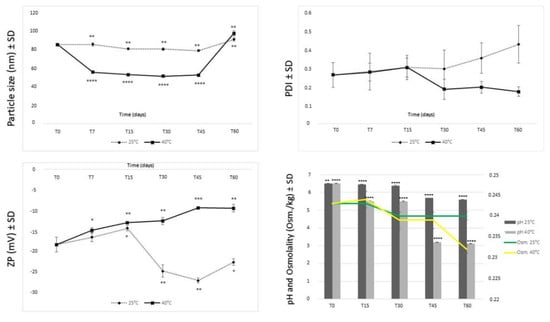 Stability studies were performed complying with ICH Q1 (stability testing). All samples were evaluated after storage at different storage conditions of 4 °C, 25 °C ± 2/60% RH (relative humidity) ± 5%, and 40 °C ± 2/75% RH ± 5% (climate chamber Blinder GmbH, Tuttlingen, Germany) by measuring Z-ave, PDI, ZP, pH, and osmolarity of the samples at specific time intervals (0, 15, 30, 45 and 60 days). The experiments were performed in triplicate.