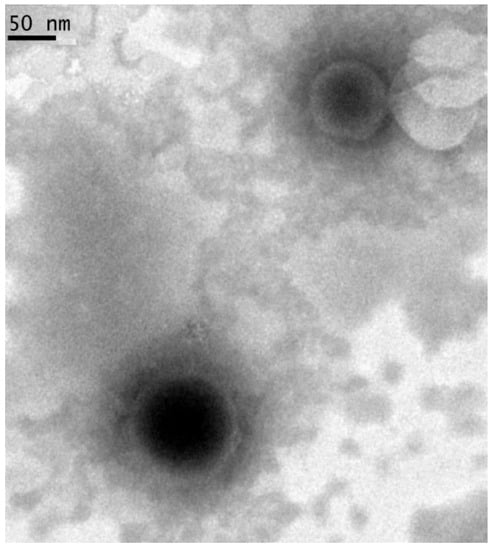 D-NLC morphology was investigated using TEM (JEOL JEM-101). The formulation (80 mM diosmin-loaded nanoparticles) was diluted 100 times with water and then deposited on the surface of a 200 mesh Formvar®-coated copper grid (TAAB Laboratories Equipment, Ltd., Aldermaston, UK). The acceleration voltage was set to 190 kV. After drying, the specimens were covered with chromium prior to imaging (Quorum Q150T ES East Grinstead, West Sussex, UK).