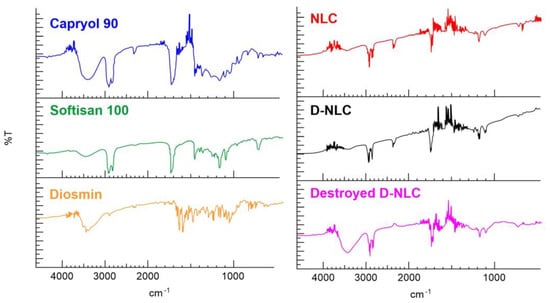 An FT-IR spectrophotometer (Perkin-Elmer Spectrum RX I, Waltham, MA, USA) was employed for the measurement of pure diosmin, lipids (Softisan® 100 and Capryol® 90), and freeze-dried optimized unloaded NLCs and D-loaded NLCs. The tool was equipped with an attenuated total reflectance (ATR) accessory and a diamond window and zinc selenide crystal (diamond/ZnSe). The dried samples were mixed with dried IR-grade KBr to obtain a homogeneous mixture, which was compressed into 1 mm pellets. The background was acquired from pure KBr pellet. For Capryol® 90 analysis, the liquid specimen was dissolved in dichloromethane and the solution was dripped onto a highly polished NaCl disk; the solvent was quickly evaporated, and the analysis was carried out as above. The background was acquired from pure dichloromethane. For each sample, 20 scans were collected at room temperature over the 400–4000 cm−1 range at a resolution of 2 cm−1.