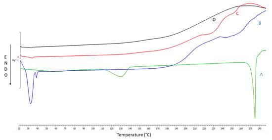 Each sample was accurately weighed (approx. 6 mg) and placed in an aluminum crucible and sealed using an aluminum lid by a sealing machine. The thermograms were obtained at a scanning rate of 5 °C/min over a temperature range of 20–290 °C (heating) and at a scanning rate of 10 °C/min (cooling). The thermal behaviors of the samples such as onset temperatures, melting points, and endothermic and exothermic enthalpies were extrapolated using the software provided (Mettler STARe Evaluation software system (version 13.00) installed on Optiplex3020 DELL (PolyScience, Niles, IL, USA).