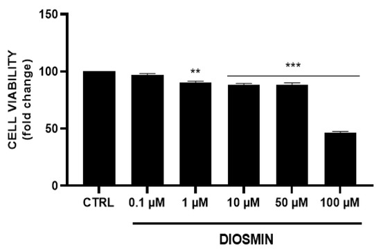 To evaluate the effect of diosmin alone and in the NLC formulations on cell viability, ARPE-19 cells were seeded in 96-well plates at a density of 10.0 × 103 cells/well in 100 µL of culture medium. After 24 h cells, were treated as mentioned before for 48 h. Following treatments, 100 µL of a 0.25 mg/mL solution of 3-(4,5-dimethylthiazol-2-yl)-2,5-diphenyltetrazolium bromide (MTT) (ACROS Organics BV) in the culture medium was added to each well, and cells were incubated for 2 h at 37 °C and 5% CO2. After incubation, the supernatant was removed, and 100 µL of DMSO was added to each well to dissolve formazan salts produced by active mitochondria. The amount of formazan was proportionate to the number of viable cells in the sample. Finally, absorbance (OD) was measured in a microplate reader (Biotek Synergy-HT, Winooski, VT, USA) at λ = 570 nm. Eight replicate wells were used for each group. At least three separate experiments were conducted.