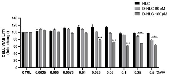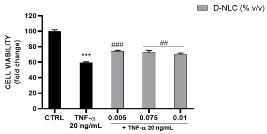 TNF-α caused a reduction of cell viability (41%) (Figure 14) which was slightly but significantly reversed by D-NLCs 160 µM at the non-cytotoxic concentrations 0.005–0.075–0.01 % v/v.