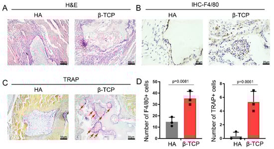 FBGC-mediated biodegradation of β-TCP is more pronounced than that of HA. (A) H and E staining showed the biodegradation of β-TCP and HA. (B) IHC staining of the macrophage’s marker F4/80. (C) TRAP staining showed the FBGCs marked by red arrows. (D) Semiquantitative comparison of positive expression. n = 3, black circles and blocks represent values from a single sample.