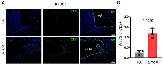 A variety of immune cells are involved in the secretion of inflammatory factors. Resting immune cells can be activated in response to micro-organisms and their products, immune complexes, chemical mediators, and T lymphocyte-derived cytokines, which initiate the secretion of a large number of inflammatory mediators [,]. In addition, our results from a preliminary study of bioceramic material implantation showed that there was a burst of aggregation of natural immune cells, such as neutrophils, dendritic cells, and macrophages, for days 1–4 after the implantation procedure, followed by a substantial decrease and stabilization, with a peak of mainly T-lymphocytes at day 14 after the procedure []. We used immunofluorescence to stain T-cell marker CD3 around HA and β-TCP, and the results showed that the number of CD3+ T-cells was significantly higher around β-TCP than HA (Figure 3A,B). Thus, T-cells may be an important cause of higher inflammatory factors in the microenvironment around the material, which triggers the formation of FBGCs, leading to material biodegradation. Existing studies have shown that the coculture of T-cells with macrophages can promote macrophage fusion into FBGCs, but it is generally believed that T-cells are not a decisive factor for FBGC formation [,].