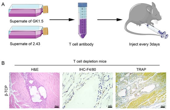 To confirm whether T-cell formation in FBGCs is necessary for formation in a bioceramic material implantation microenvironment, we cleared CD3+ T-cells in mice by intraperitoneal injection of hybridoma cells GK1.5 and 2.43 culture supernatants (Figure 4A). Although the nude mouse has been used as a conventional animal model for T-cell development defects, congenital systemic T-cell development defects have been reported to have significant effects on the hematopoietic system and metabolism, which are important factors affecting bone repair in addition to adaptive immune responses [,]. Therefore, we chose to use depleting antibodies to clear T-cells to obtain the least disruptive effect. Therefore, we injected antibodies every 3 days to ensure that the clearance efficiency of T-cells was maintained at 90% during the model study phase. This method has been accepted by the industry and has been used in several studies, meeting experimental standards [,]. The T-cell depletion mice were implanted with β-TCP in the gastrocnemius muscle, and paraffin sections were taken 14 days later, and HE staining showed that β-TCP remained relatively intact in the T-cell depletion mice with a reduced degradation rate. Immunohistochemistry and TRAP staining showed that F4/80+ macrophages were present less around the material and almost no FBGC formation was detected (Figure 4B). The above results confirm that the absence of T-cells present directly leads to the inability of FBGCs to form and affects the biodegradation of the material.