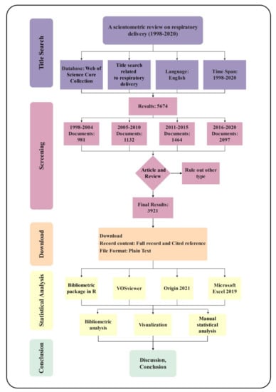 All literature data were retrieved from the Web of Science Core Collection database on 11 October 2021. Respiratory delivery-related literature was collected using the search term “TI = (intranasal administration) OR TI = (intranasal delivery) OR TI = (nasal drug delivery) OR TI = (inhalation therapy) OR TI = (aerosol inhalation) OR TI = (nebulized inhalation) OR TI = (respiratory administration) OR TI = (respiratory drug delivery) OR TI = (inhaled drug) OR TI = (inhalation drug) OR TI = (atomization inhalation) OR TI = (nasal administration) OR TI = (inhaled medicines) OR TI = (inhaler therapy) OR TI = (pulmonary drug delivery) OR TI = (pulmonary administration) OR TI = (intratracheal administration) OR TI = (intrabronchial administration) OR TI = (dry powder inhalation)” in the advanced search. The flow chart of scientometric analysis of respiratory delivery is presented in Figure 1.
