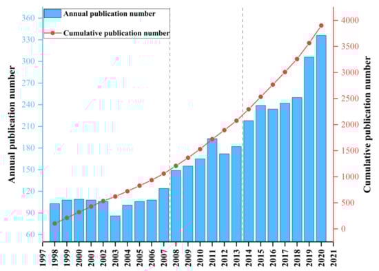 Initially, 5674 articles published from 1998 to 2020 were identified. By screening the articles whose type was article or review, the final number of documents was 3921. From 1998 to 2020, 16,878 authors published 3921 articles on respiratory delivery in 1095 journals. The number of articles is essential to evaluate the field’s development trend and status quo. It was worth noting that the annual number of articles published on respiratory delivery increased from 103 in 1998 to 336 in 2020.