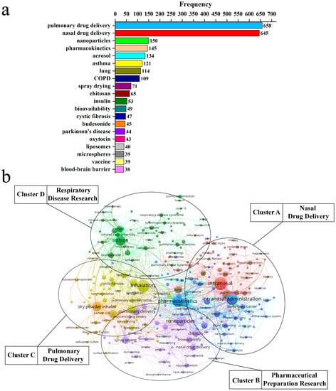 A co-occurrence analysis of keywords can help to classify the main knowledge structures and hotspots. We used the VOSviewer software to generate the high-frequency keyword co-occurrence network through literature data analysis (Figure 3b). It was found that keywords were divided into four clusters: (1) nasal drug delivery: BBB, brain targeting, nasal vaccine, brain delivery, nose to brain delivery, etc. (Cluster A); (2) pharmaceutical preparation research: nanoparticles, chitosan, nanocarriers, formulation, etc. (Cluster B); (3) pulmonary drug delivery: dry powder inhaler, inhalation, pulmonary delivery, lung deposition, aerosols, etc. (Cluster C); and (4) respiratory disease research: asthma, COPD, COVID-19, pulmonary arterial hypertension, etc. (Cluster D). Additionally, the analysis results of institutional contribution (Figure S1a), coun-try/region cooperation (Figure S1b,c), high-yield journals (Table S1), and high-ly-cited papers (Table S2) are presented in supplementary materials.