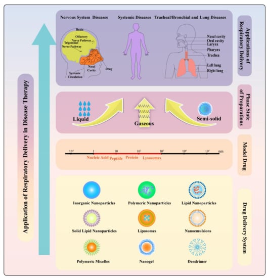 Advances in anatomy and physiology provide advantageous features that make respiratory delivery an excellent route in drug delivery therapies. Novel drug formulations and devices are simultaneously developed to achieve more efficient drug delivery through the respiratory route. Nanoformulation is a particularly promising formulation for overcoming drug delivery barriers. Nanocarriers improve the efficiency of the drug and are promising viable formulations, making them important targets for research in preclinical and clinical practice [4]. In recent years, the study of respiratory delivery has increased markedly; however, theoretical reviews in respiratory delivery have rarely been summarized.