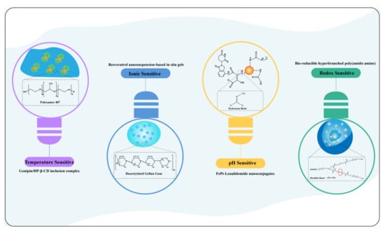 Stimuli-sensitive preparations for respiratory delivery. Purple cluster: temperature-sensitive formulation, genipin/HP-β-CD inclusion complex; blue cluster: ionic-sensitive formulation, resveratrol nanosuspension-based in situ gels; orange cluster: pH-sensitive formulation, FePt-Lenalidomide nanoconjugates; green cluster: redox-sensitive formulation, bio-reducible hyperbranched poly (amido amine) [19,20,21,22].