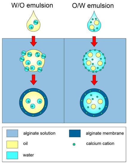 Another approach is reverse gelation, which is based on the dropwise addition of a medium containing gelling agents to the polymer solution. Such a method can be typically used in the case of emulsions for the preparation of polymer-based soft-shell microcapsules with oil content. This method uses small amounts of biopolymer, resulting in forming of a soft molecular shell. The distinctive features of the microcapsules obtained (e.g., mechanical properties and release of API) may vary depending on the type of emulsion used (W/O or O/W), as shown in Figure 1 [34,35,36].