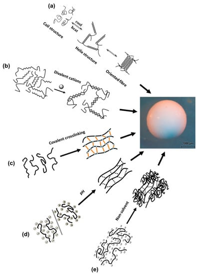Schematic illustration of the mentioned mechanisms of formation of polymer hydrogel particles: (a) temperature-induced (thermotropic) gelation in which the polysaccharides undergo the structural transition from the coil to helix and then to double helix, (b) ion-induced (ionotropic) gelation in which the polysaccharide molecules are crosslinked by ions, (c) covalent crosslinking approach in which the polysaccharide chains are covalently crosslinked to form gel network, (d) pH-induced gelation, and (e) non-solvent approach to producing a non-solvent filled gel network [37].