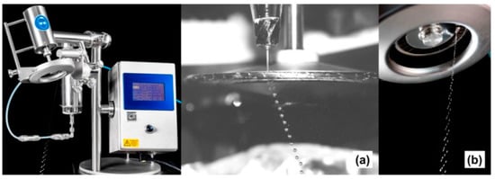 In the electrostatic method droplets, forming can be amplified by using an electric field as the initial mixture is forced through the charged matrix. Such a field draws the mixture in the form of droplets from the outlet of the orifice. An induced electrostatic charge is applied to the surface of the polymer solution droplets when it is torn out of the orifice. Coalescence is prevented via the electrostatic repulsion of liquid droplets in the gaseous phase. Droplet disintegration and droplet size are dependent on parameters such as mixture viscosity, nozzle diameter, distance to the gelling bath, and applied voltage. The obtained droplet size can be decreased to tens of micrometers by reducing the nozzle diameter, decreasing the distance between the electrodes, and increasing the applied voltage [56,57]. Processing efficiency can be improved by applying a multi-nozzle system. Such droplet formation can be compared to electrostatic atomization. However, unlike electrostatic spraying, in which overpressure is used, liquid droplets are formed from a single, low-velocity jet at the exit of a narrow nozzle. This method is characterized by producing droplets of very similar size. The applied electric potential can be static or pulsating. Among the drawbacks of this method, a limitation to low-viscosity liquids has to be mentioned [57].