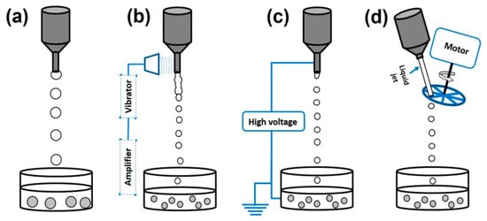 Illustration of dropping devices: (a) conventional dropping method influenced by gravity, surface tension, and viscosity; breaking up of liquid jets into droplets stimulated by (b) vibrating nozzle method, (c) electrostatic forces, and (d) a mechanical cutting device [37].
