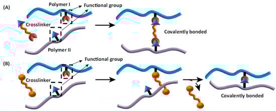 Chemical crosslinking may occur by a reaction between functional groups of polymer(s) and a crosslinking agent which acts as a covalent link between the chains (A) or the reaction between the polymer chains and a crosslinker which acts to connect the chains but is disposed of after the reaction (B) Reprinted with permission from [24]. Copyright 2022, Elsevier.