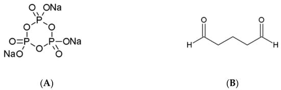 Glutaraldehyde is a highly effective chemical cross-linker with a very wide spectrum of applications. Its aldehyde groups are highly reactive and create covalent bonds with hydroxyl groups, amines, thiols, imidazoles, and phenols [101]. In an alkaline aqueous environment, GA undergoes the aldol condensation reaction resulting in the formation of -CH=C(CHO)- polymeric chains. The main purpose of using GA as a crosslinking agent is to obtain materials with increased resistance and stability to the aqueous environment while maintaining biocompatibility and the ability to release active substances in a specific place of the organism. The chemical structures of both STMP and GA are presented in Figure 6.