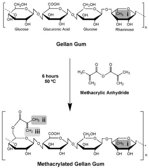 Synthesis of MeGG (i—methyl group of rhamnose, ii—methyl group of methacrylic anhydride, iii—vinyl group of methacrylic anhydride) Reprinted with permission from [106]. Copyright 2022, Elsevier.