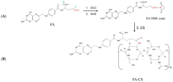 Reaction scheme for the synthesis of (A) FA-NHS-ester using DCC and NHS in DMSO, 24 h, room temperature; (B) FA-CS using the FA-NHS ester and CS solution, 24 h, room temperature.
