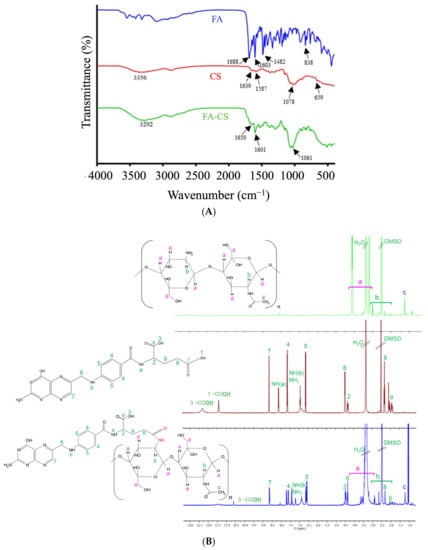 Characteristics of FA, CS, and FA-CS conjugates: (A) FT-IR spectra; (B) 1H-NMR spectra.