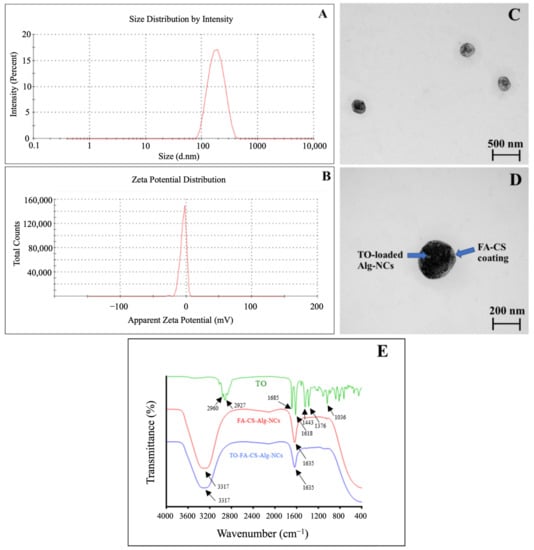Physico-chemical characteristics of the optimized TO-FA-CS-Alg-NCs: (A) Size distribution by intensity; (B) Zeta potential distribution; (C,D) TEM images at 50,000 and 100,000 magnification, respectively; (E): FT-IR spectra of TO, FA-CS-Alg-NCs and TO-FA-CS-Alg-NCs.