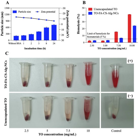 The particle size and zeta potential of nanoparticles can alter after serum protein binding. A modified in vitro protein adsorption method described by Yallapu et al. [] was used to assess this phenomenon. In brief, 0.1 mg of bovine serum albumin (BSA) powder was dispersed into 1 mL of TO-FA-CS-Alg-NCs suspension and magnetically stirred at 25 °C for 1, 2, 4, 8, and 24 h. The solution was then centrifuged at 10,000 rpm for 15 min to obtain BSA-bound nanoparticles. Finally, the particle size and zeta potential of BSA-bound nanoparticles were measured using the Zetasizer as described above. The measurement was performed in triplicate.