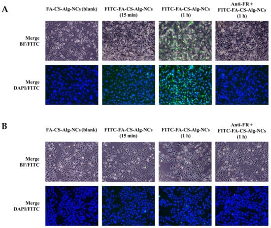 Cellular uptake of FITC-FA-CS-Alg-NCs in (A) MDA-MB-231 and (B) MCF-10A cells at 15 min and 1 h incubation times. Cells were also pre-treated with anti-human folate receptors αβ antibody (anti-FR) for 30 min prior to FITC-FA-CS-Alg-NCs treatment for 1 h. The green color indicates the uptake of FITC-FA-CS-Alg-NCs, while the blue color indicates the nuclei stained with DAPI. Merged images between brightfield (BF)-FITC and DAPI-FITC show the internalization of FITC-FA-CS-Alg-NCs in the cells.