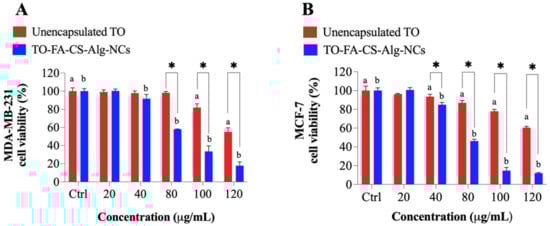 The viability of (A) MDA-MB-231 and (B) MCF-7 treated with unencapsulated TO and TO-FA-CS-Alg-NCs at different concentrations. a,b p < 0.05 compared to the control (a DMSO in red and b empty FA-CS-ALG-NCs in blue), * p < 0.05 between unencapsulated TO and TO-FA-CS-ALG-NCs.