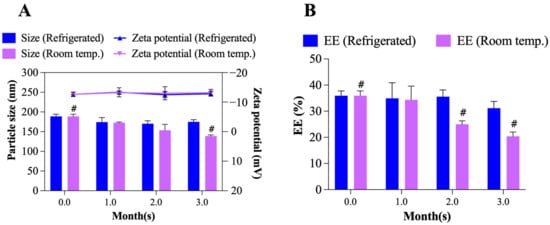 Storage stability of TO-FA-CS-Alg-NCs: (A) particle size and zeta potential, (B) EE after 3 months of storage in different temperature conditions. # p< 0.05 compared to Month 0.