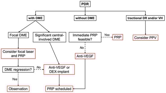 Treatment decisions may be different for each manifestation and may be modified based on its behavior. We must not forget that both DME and PDR are different manifestations of DR and therefore must be assessed individually. We propose, therefore, a treatment algorithm including these two diabetic complications (Figure 1) [96].