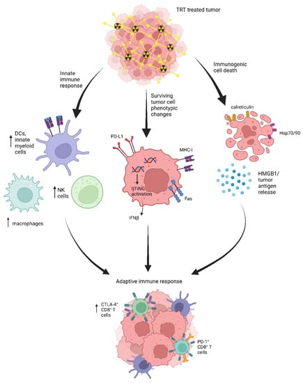 Innate immune populations involved in the initial response to radiation therapy and establishing an adaptive response have been shown to be affected by TRT. Gorin et al. demonstrated that 213Bi treated MC38 cells increased dendritic cell (DC) maturation and activation in vitro [50]. Patel et al. noted increased myeloid cells and natural killer (NK) cells in B78 melanoma tumors one and seven days, respectively, following 50 μCi (2.5 Gy) 90Y-NM600 [53]. In 30 patients with mCRPC receiving 223Ra, peripheral blood mononuclear cell (PBMC) phenotyping over six months revealed an immunosuppressive phenotype with an increase in both myeloid-derived suppressor cells (MDSCs) and regulatory T cells (Tregs), and an overall decrease in absolute lymphocyte counts. No differences in PBMC populations were noted in subgroup analysis of patients with alkaline phosphatase response [54]. Whether these PBMC changes reflect TME immune cell populations is unknown, but this initial study suggests that it will be important to understand these immunosuppressive mechanisms and how they may affect anti-tumor immunity.