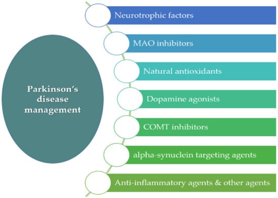 There are several therapeutic options for the management of PD, including the administration of levodopa, dopamine agonists, monoamine oxidase B (MAO-B) inhibitors, catechol-o-methyl transferase (COMT) inhibitors, and anticholinergic agents, among others [8,11,12] (Figure 1).