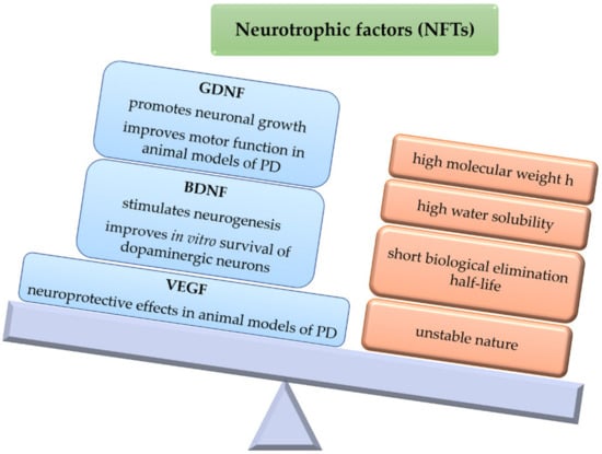 Therefore, NFs (GDNF, BDNF, VEGF) are of interest as potential therapeutic strategies for PD. Different polymeric systems have been developed that include GDNF or VEGF alone [40,42], GDNF and BDNF together [43], or VEGF [40].