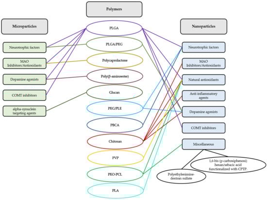In recent years, different multiparticulate systems, such as polymeric MPs, have been designed as potential therapeutic approaches for PD. MPs are structures with sizes ranging from 1 to 1000 µm [26]. Among the advantages of MPs is the possibility of achieving the controlled release of the active ingredients at the target site. This is of great interest for drugs that have limited access to the CNS. In addition, reduced adverse systemic effects and less frequent dosing intervals can be also achieved by MPs. Under investigation are different antiparkinsonian agents encapsulated within polymeric MPs, including neurotrophic factors such as glial-cell-derived neurotrophic factor (GDNF) and vascular endothelial growth factor (VEGF), antioxidant agents, inhibitors of different enzymes such as monoamine oxidase (MAO) and catechol-O-methyltransferase (COMT), anti-inflammatory compounds, as well as α-synuclein-targeting agents.