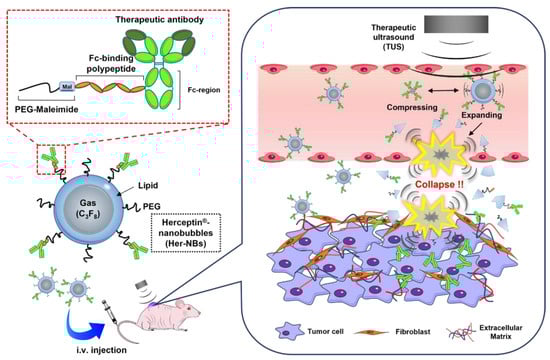 The efficacy and tumor accumulation of therapeutic antibodies go hand-in-hand with successful solid cancer therapy. However, the penetration of therapeutic antibodies into tumors is limited by the tumor microenvironment (TME), resulting in reduced therapeutic efficacy and drug resistance []. Therefore, the development of antibody-delivery systems is required to overcome these barriers to enhance antibody permeability. Combination therapy with agents such as hyaluronidase may mitigate tumor barriers. However, the combination therapy has not been used widely for clinical applications since multiple organ damages were caused by these agents [,]. Therefore, the development of noninvasive approaches for antibody delivery is essential for use in clinical settings. Here, we focused on micro/nanobubble-mediated drug delivery systems. The combination of micro/nanobubbles and therapeutic ultrasound (TUS) has been suggested as a safe and effective method for delivering drugs to the target organs [,,,].