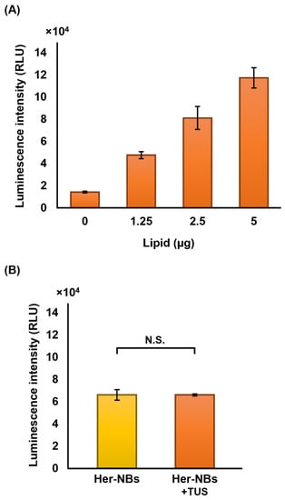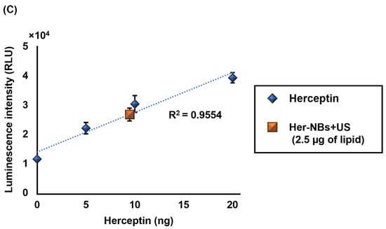 To clarify the effects of ultrasound exposure, the activity of Herceptin on Her-NBs after TUS exposure was evaluated by quantifying NFAT-mediated luciferase activity in effector cells using the ADCC reporter bioassay. As shown in Figure 3A, the luminescence intensity of the treatment group of Her-NBs after TUS exposure increased with increasing lipid concentration, whereas that of the treatment group of PEG-NBs after TUS exposure was similar to that of the control group (Figure S1). These results suggest that the activity of Herceptin remained after TUS exposure. In addition, when the luminescence intensities of Her-NBs after TUS exposure were compared with those of Her-NBs before TUS exposure, these values were almost identical (Figure 3B). This suggests that TUS exposure did not affect the antibody activity. To measure the amount of Herceptin on Her-NBs, the antibody titer of Herceptin in Her-NBs was calculated using a calibration curve (R2 value ≥ 0.95) of the luminescence intensity of Herceptin alone (Figure 3C). We found that the titer was approximately 0.38 ± 0.06 µg of Herceptin per 100 µg of lipid in Her-NBs.