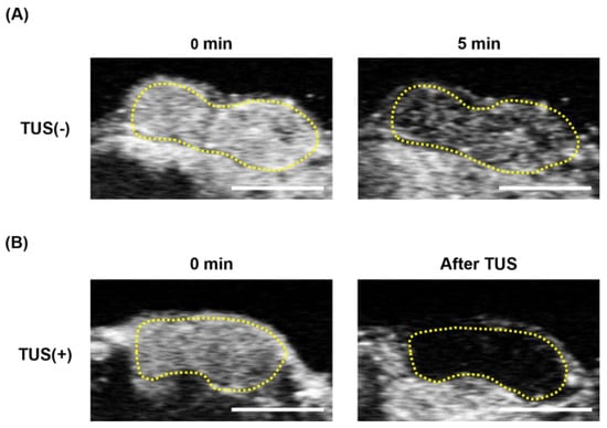 When the tumor reached approximately 200–300 mm3, Her-NBs (200 µg/200 µL) were administered to the mice under anesthesia via the tail vein in an insulin syringe with a 30-gauge needle (NIPRO Co., Ltd., Osaka, Japan), and US images of Her-NBs were observed in the tumors. US imaging was performed using an Aplio80 US diagnostic machine (Toshiba Medical Systems, Tokyo, Japan) and a 12-MHz wideband transducer with contrast harmonic imaging at a mechanical index of 0.27. In the case of TUS exposure, a TUS probe was positioned on the tumors immediately after administration and exposed to ultrasound under the same conditions as in Section 2.6.