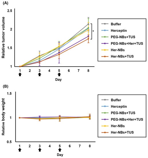 In vivo efficacy of the combination of Her-NBs and TUS exposure against SKOV3 tumor models. Tumor growth rate (A) and changes in body weight (B) on day 8. Tumor-bearing mice (tumor volume: approximately 65 mm3) were injected with PBS, Herceptin (0.8 μg/head), or NBs three times every other day. The black arrows indicate treatment days. The tumor was exposed to TUS (frequency, 1 MHz; duty, 50%; intensity, 1 W/cm2; time, 2 min) immediately after injection in the TUS-exposure groups. Relative tumor volumes and relative body weights are expressed as multiples of the initial volumes on day 1. Data = mean ± SD (n = 4). * p < 0.05 (one-way ANOVA followed by the Tukey’s test).