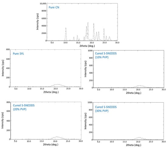 XRD analysis of pure CN and cured S-SNEDDS at different percentages of PVP.