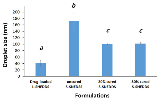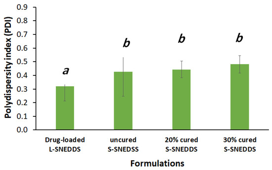 Uncured S-SNEDDS showed significantly higher droplet sizes compared to liquid SNEDDS and 20% and 30% cured S-SNEDDS formulations (Figure 4). Interestingly, the L-SNEDDS exhibited a significant reduction in both formulation droplet size and PDI, compared to the uncured and cured S-SNEDDS counterparts (Figure 4 and Figure 5).