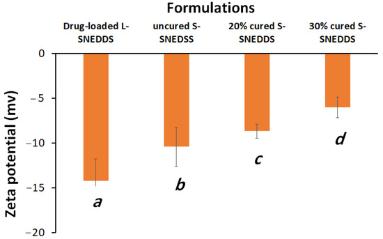 On the other hand, solidified S-SNEDDS showed a significant increase in the ZP value compared to liquid SNEDDS as follows: drug-loaded L-SNEDDS < uncured S-SNEDDS < 20% cured S-SNEDDS < 30% cured S-SNEDDS with significant differences between each formulation (Figure 6).