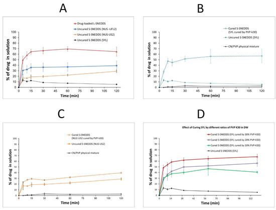 The cured S-SNEDDS (comprising SYL cured by 10% PVP-k30) showed a maximum of 47% CN release (Figure 8C), which was increased to 56% and 68% release in the case of using 20% and 30% PVP-K30. In contrast, the uncured SYL formula showed a negligible CN release (less than 13%) within 2 h.