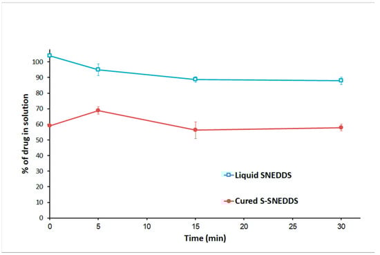 Influence of in vitro lipolysis on the % drug in solution FESSIF conditions. Data are expressed as mean ± SD, n = 3. Cured S-SNEDDS was represented by cured S-SNEDDS (comprising SYL cured by 20% PVP).