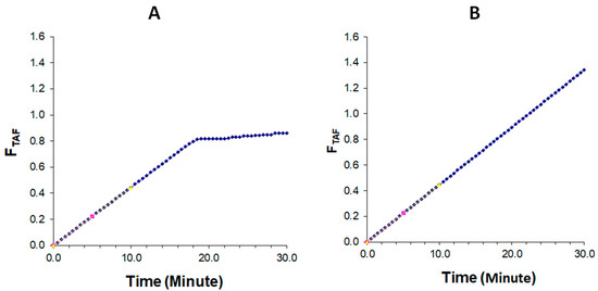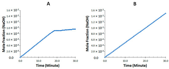 The lipid digestion progress was generally monitored by quantifying the digestion rate and extent indirectly via titration of the fatty acid produced [27]. The digestion profiles illustrated the mole fraction of titrated NaOH and total available free fatty acid (FA) under fed conditions. For liquid SNEDDS and cured S-SNEDDS, the initial (0–10 min) rate of reaction was rapid and accounted for over 25% of the final mole fraction of titrated NaOH and total available fatty acid (FA) liberated during 30 min (Figure 10 and Figure 11). For drug-loaded liquid SNEDDS, the lipolysis rate dropped off steeply under fed conditions and become approximately linear after ~18 min (Figure 10A and Figure 11A). Instead, the initial rapid digestion rate (0–10 min) continued similarly over the 30 min period in the case of cured S-SNEDDS (Figure 10B and Figure 11B). The initial digestion rate of liquid SNEDDS and cured S-SNEDDS was almost similar in fed state conditions (Figure 10 and Figure 11).
