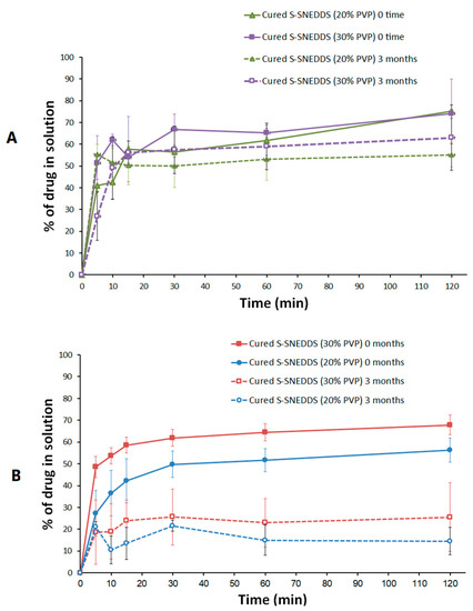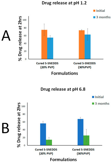 Regarding the in vitro dissolution at pH 1.2, the cured S-SNEDDS (20% and 30% PVP) showed about 20% and 11% decrease in drug release at 2 h, upon storage for 3 months (Figure 15A). These data are strongly correlated with the chemical stability data that showed a relative decrease in intact drug amount upon storage for 3 months. In contrast, the in vitro dissolution at pH 6.8 revealed that cured S-SNEDDS (20% and 30%) showed a significant drop in drug release after 3 months. The results analysis showed that cured S-SNEDDS (20% and 30% PVP) showed an ≈ 42% drop in drug release at 2 h (Figure 15B). These findings reveal that the drop in drug release at pH 6.8 was not attributed to chemical degradation only but also to drug and/or SNEDDS impediment within the adsorbent. Previous studies suggested several mechanisms to explain the incomplete release of drug/SNEDDS from the silica adsorbents [8,30].