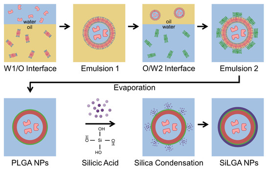 Synthesis of PLGA and SiLGA nanoparticles: Enzyme-encapsulated SiLGA NPs were synthesized using a water-oil-water double emulsion (PLGA NPs) and subsequent sol-gel polycondensation reaction of silicic acid to silica. Enzyme molecules (pink) were suspended in the first water phase (“W1”; blue). PLGA molecules (red and blue) were dissolved in an organic phase (“O”; yellow). The two phases were emulsified to form “Emulsion 1”, consisting of a suspension of aqueous droplets in oil. Emulsion 1 was then introduced to a second water phase (“W2”; blue) containing PVA molecules (green). A second emulsification produced “Emulsion 2”, which consisted of an aqueous suspension of oil droplets with an aqueous core. Subsequent evaporation of the oil phase solvent yielded an aqueous suspension of PLGA NPs (red) with an enzymatic core (pink) that was stabilized by PVA (green). Subsequent introduction of silicic acid (purple dots) initiated a polycondensation reaction, forming a porous silica layer (purple) at the surfaces of the PLGA NPs to form SiLGA NPs. A portion of this figure was created using Biorender.com (BioRender 2021), accessed on 18 October 2021.