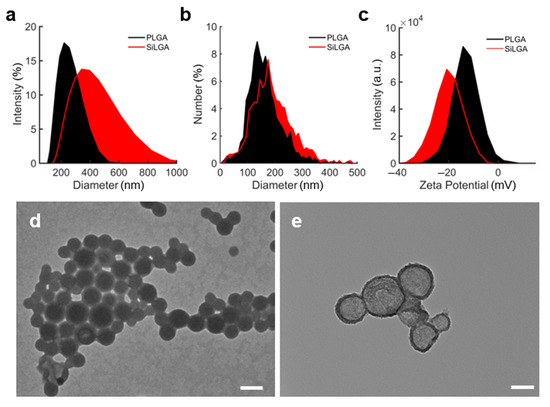 DLS, NTA, and TEM show silica coating: Distributions of (a) Cumulant hydrodynamic diameters, (b) hydrated diameters, and (c) Zeta potential of PLGA (black) and SiLGA (red) NPs. Transmission electron micrographs of (d) PLGA NPs (scale bar is 200 nm) and (e) SiLGA NPs (scale bar is 100 nm).