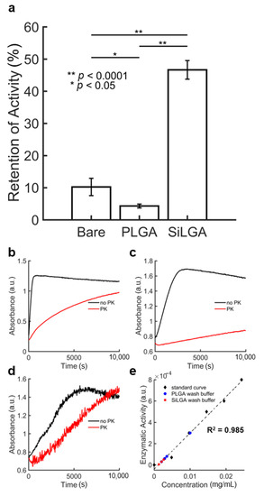 SiLGA NPs were notably more effective than PLGA NPs at protecting encapsulated penicillinase from proteolysis via PK (Figure 3a). Activity retention of the SiLGA formulation (46.7 ± 2.9%) after incubation with PK was approximately tenfold higher (p = 0.00002) than PLGA (4.33 ± 0.58%), which exhibited activity retention on par with unencapsulated penicillinase (10.2 ± 2.7%; “Bare”). Given that activity retention of the unencapsulated formulation was slightly greater than that of the PLGA formulation, a longer incubation period, a lower concentration of unencapsulated penicillinase, and/or a higher concentration of PK may have been necessary. Enzymatic activity levels were determined from representative curves that show shifts in optical absorbance as penicillinase in unencapsulated (Figure 3b), PLGA (Figure 3c), and SiLGA (Figure 3d) formulations catalyze nitrocefin before (black) and after (red) PK treatment. These results suggest that the silica coating protects loaded enzymes from large molecules, while still allowing for the passage of small molecules.